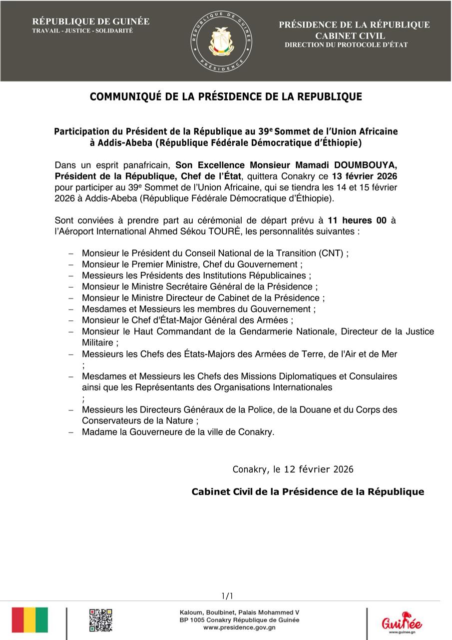 ACTUALITE ANNONCES POLITIQUE Société 39 e sommet de l’UA : Mamadi Doumbouya en route pour Addis-Abeba 13 février 202613 février 2026 admin