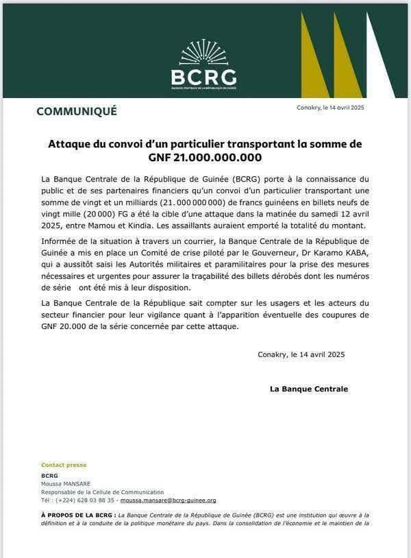 ACTUALITE ECONOMIE POLITIQUE Société Braquage de 21 milliards de GNF : la BCRG lance la traque 16 avril 202516 avril 2025 admin