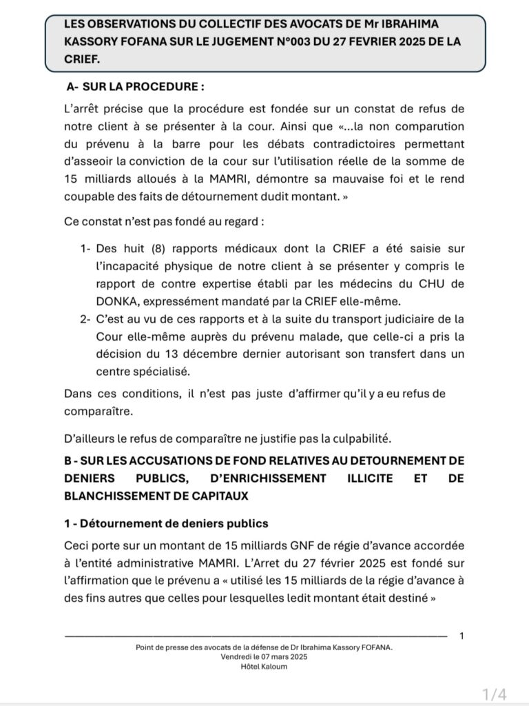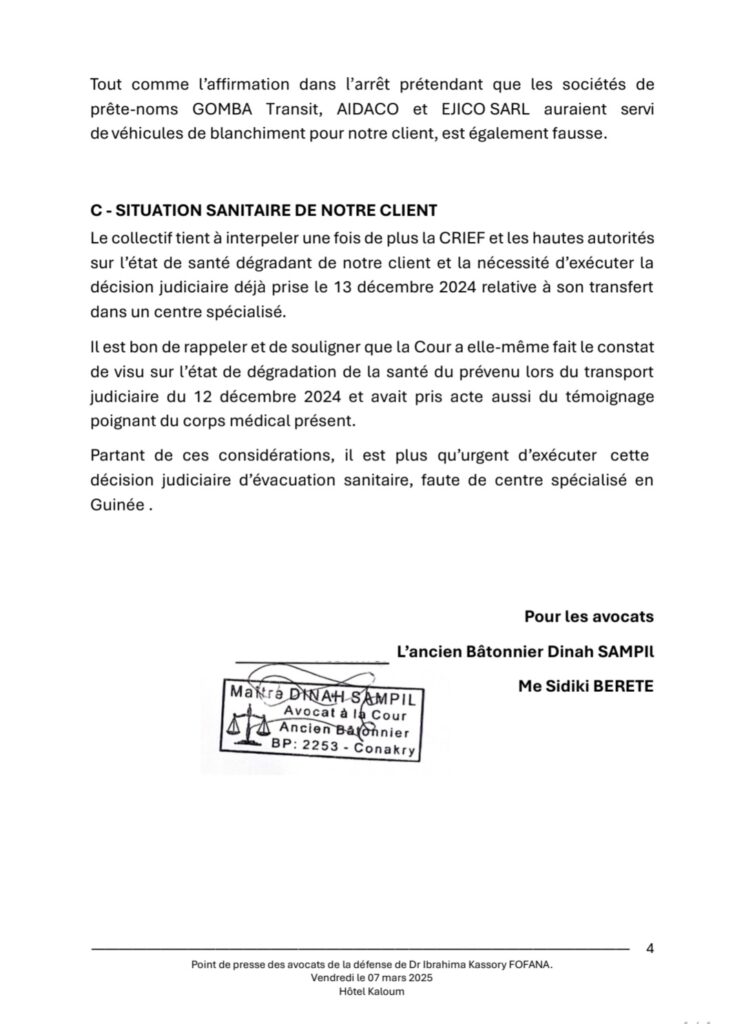 Me Dinah Sampil, l’un des avocats du Dr Ibrahima Kassory Fofana, récemment condamné à cinq ans d’emprisonnement pour des actes de détournement de fonds publics s’élevant à 15 milliards de francs guinéens et d’enrichissement illicite, a tenu une conférence de presse ce vendredi 7 mars 2025 pour critiquer cette sentence prononcée par la chambre de jugement de la Cour de répression des infractions économiques et financières (CRIEF).