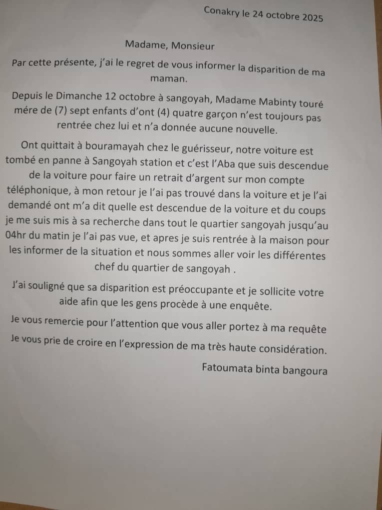 Selon les informations communiquées par sa fille, Fatoumata Binta Bangoura, la disparition est survenue alors qu’elles revenaient de Bouramayah, où elles s’étaient rendues chez un guérisseur. Leur véhicule étant tombé en panne à Sangoyah station, Mme Touré serait descendue de la voiture au moment où sa fille s’éloignait pour effectuer un retrait d’argent sur son compte mobile.