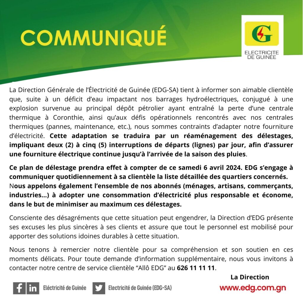 𝐂𝐨𝐦𝐦𝐮𝐧𝐢𝐪𝐮𝐞́ 𝐄𝐃𝐆 : Réaménagement du Programme de délestage sur le système interconnecté de Conakry (RIC) à compter du samedi 6 avril 2024.