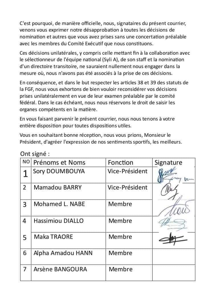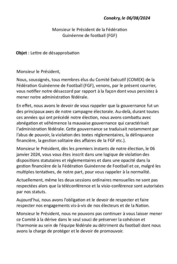 ACTUALITE Sports FEGUIFOOT : vers une nouvelle crise ? 12 août 202412 août 2024 Moussa SIBY Les membres du Comité Exécutif 𝗱𝗲 𝗹𝗮 𝗙é𝗱é𝗿𝗮𝘁𝗶𝗼𝗻 𝗚𝘂𝗶𝗻é𝗲𝗻𝗻𝗲 𝗱𝗲 𝗙𝗼𝗼𝘁𝗯𝗮𝗹𝗹 ont 𝗻𝗼𝘁𝗶𝗳𝗶é 𝘃𝗶𝗮 𝘂𝗻 𝗰𝗼𝘂𝗿𝗿𝗶𝗲𝗿 leur 𝗱é𝘀𝗮𝗰𝗰𝗼𝗿𝗱 𝗳𝗮𝗰𝗲 à 𝗹𝗮 𝗴𝗲𝘀𝘁𝗶𝗼𝗻 𝗱𝗲 𝗕𝗼𝘂𝗯𝗮 𝗦𝗮𝗺𝗽𝗶𝗹 qu’ils jugent « opaque ».