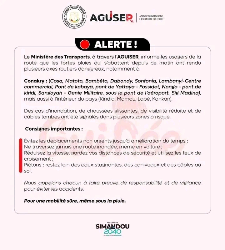 ACTUALITE Fortes pluies à Conakry : l’AGUISER alerte les conducteurs 26 juillet 202526 juillet 2025 admin