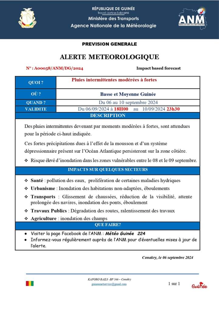 ACTUALITE FAITS-DIVERS Météo : risques d’inondation en basse et moyenne Guinée du 6 au 10 septembre 6 septembre 20246 septembre 2024 Moussa SIBY